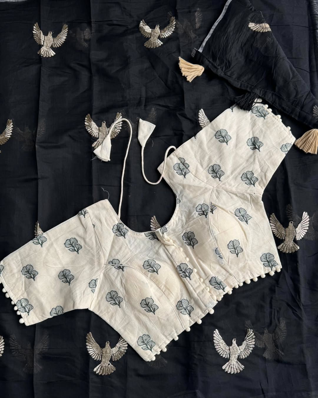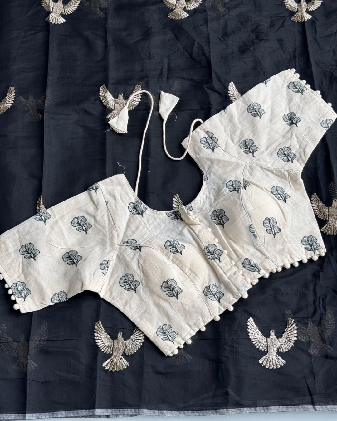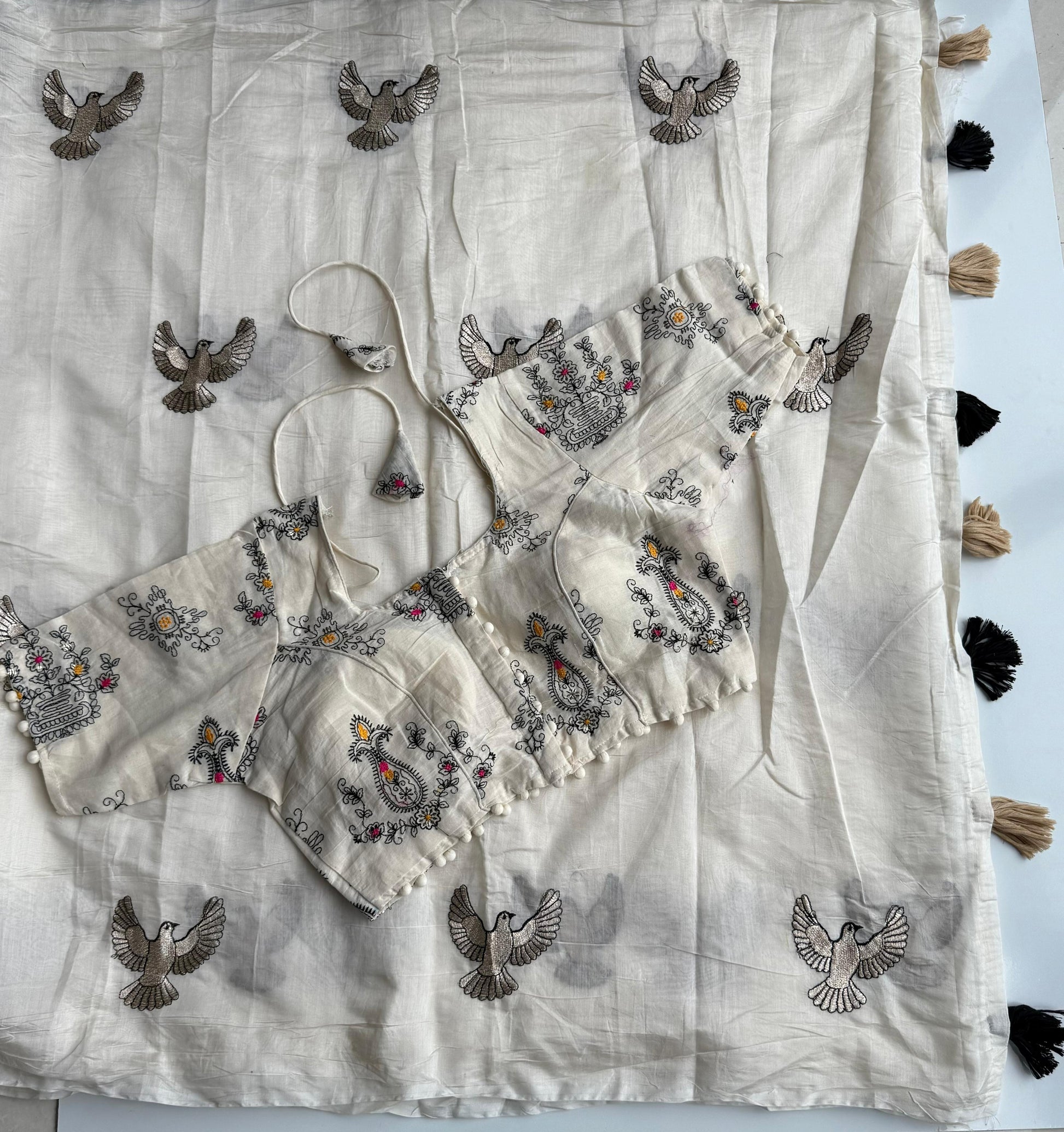 Premium Chanderi saree withEAGLE work on all over the saree Cotton tassels attached on saree Teamed with pure khadhi stitched blouse piece (Free Size)Embroidery work on blouse piece as shown