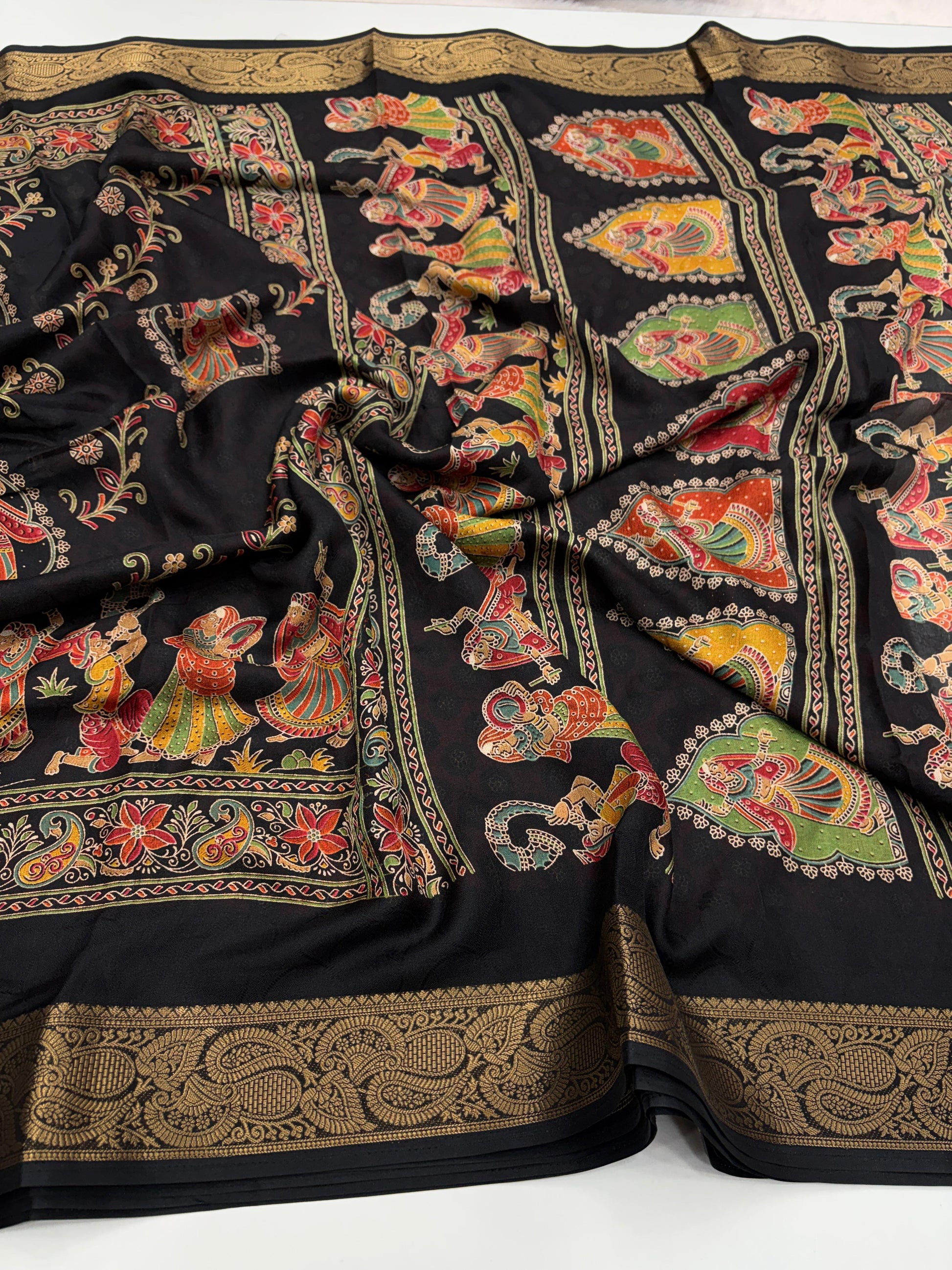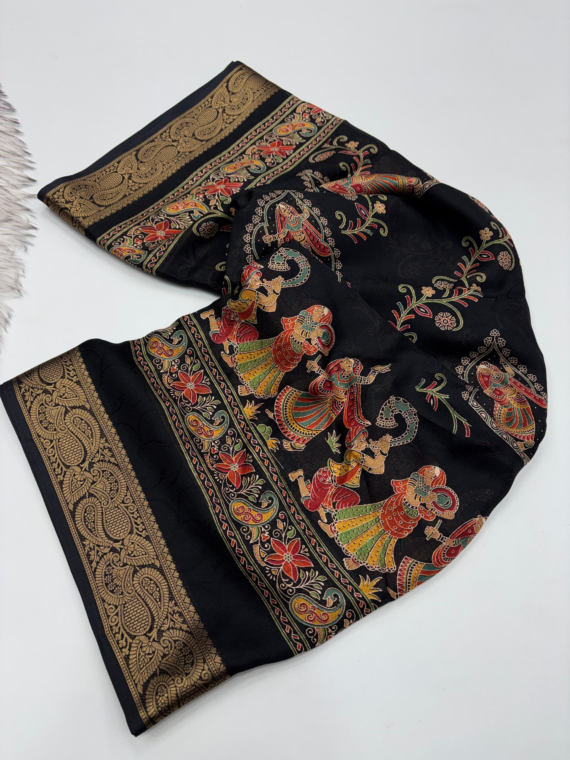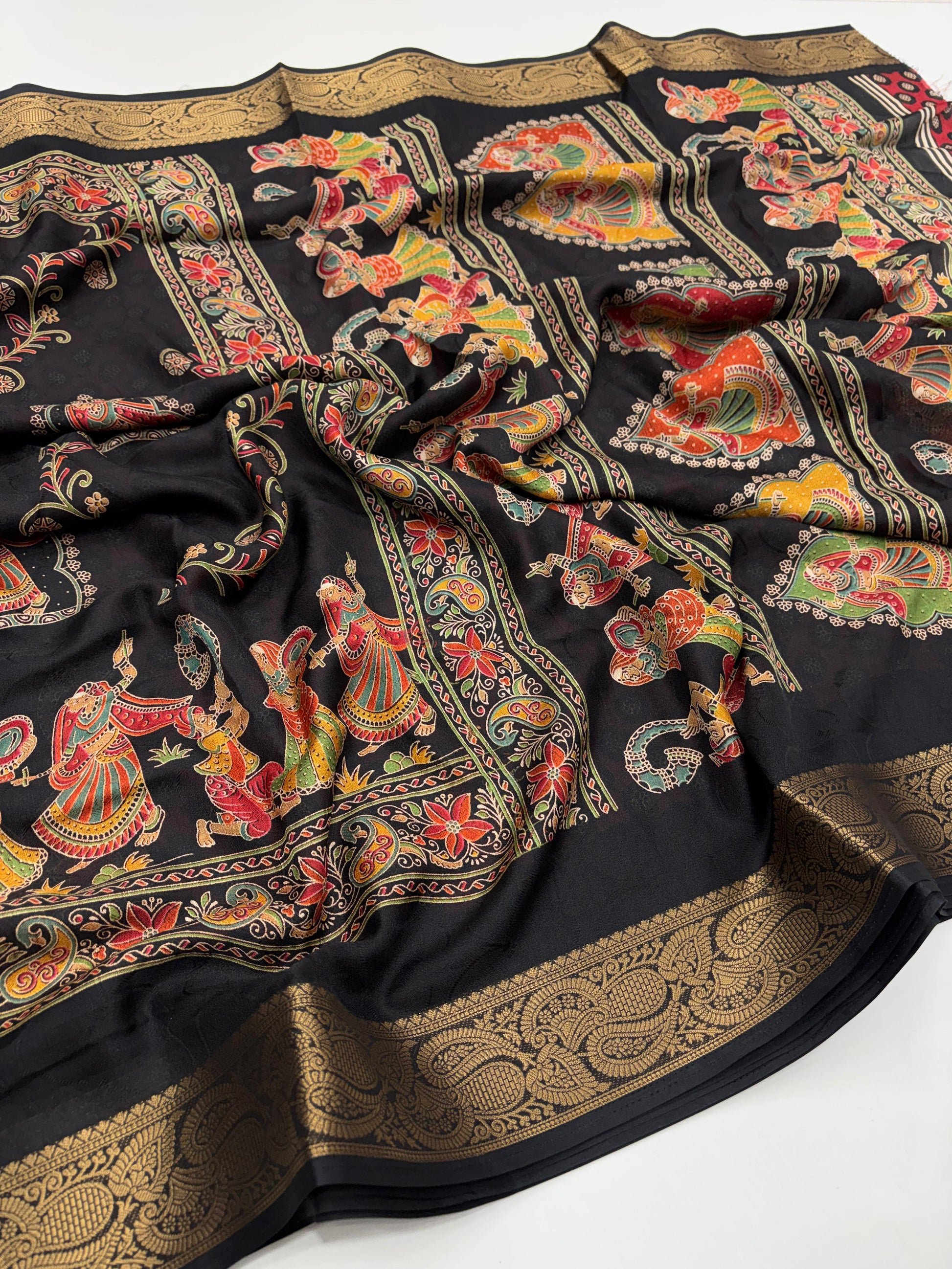 Fabric - Pure Soft Marsh mellow silk Saree with Designer Uniquep Print All over Sarees With Unique Jari Border