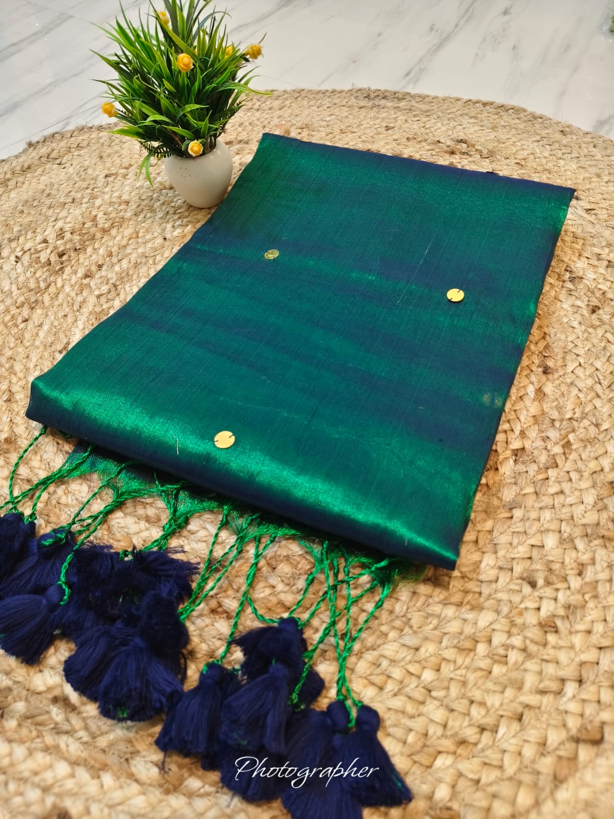 RAGA TISSU COTTON SAREE WITH EXCLUSIVE HAND STITCHED WEAVING FOIL MIRROR ALL OVER SAREE WITH LONG TURSEL*l