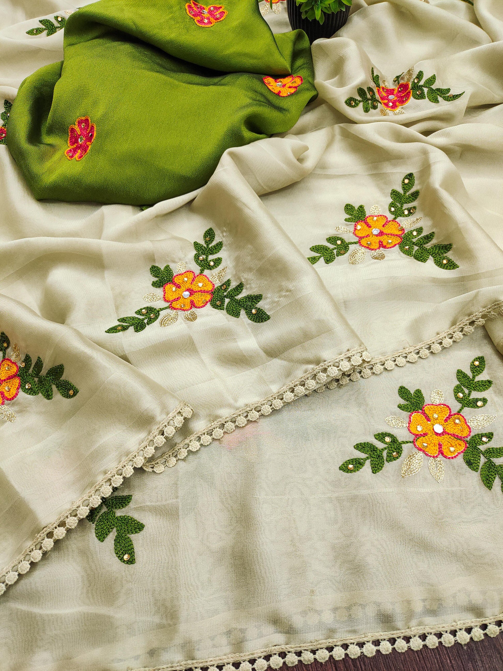Saree Fabric- Viscos Rangoli with Floral Wool Thread Embroidery Work with Real Mirror & Diamond 🪞 work scalloped lace border
